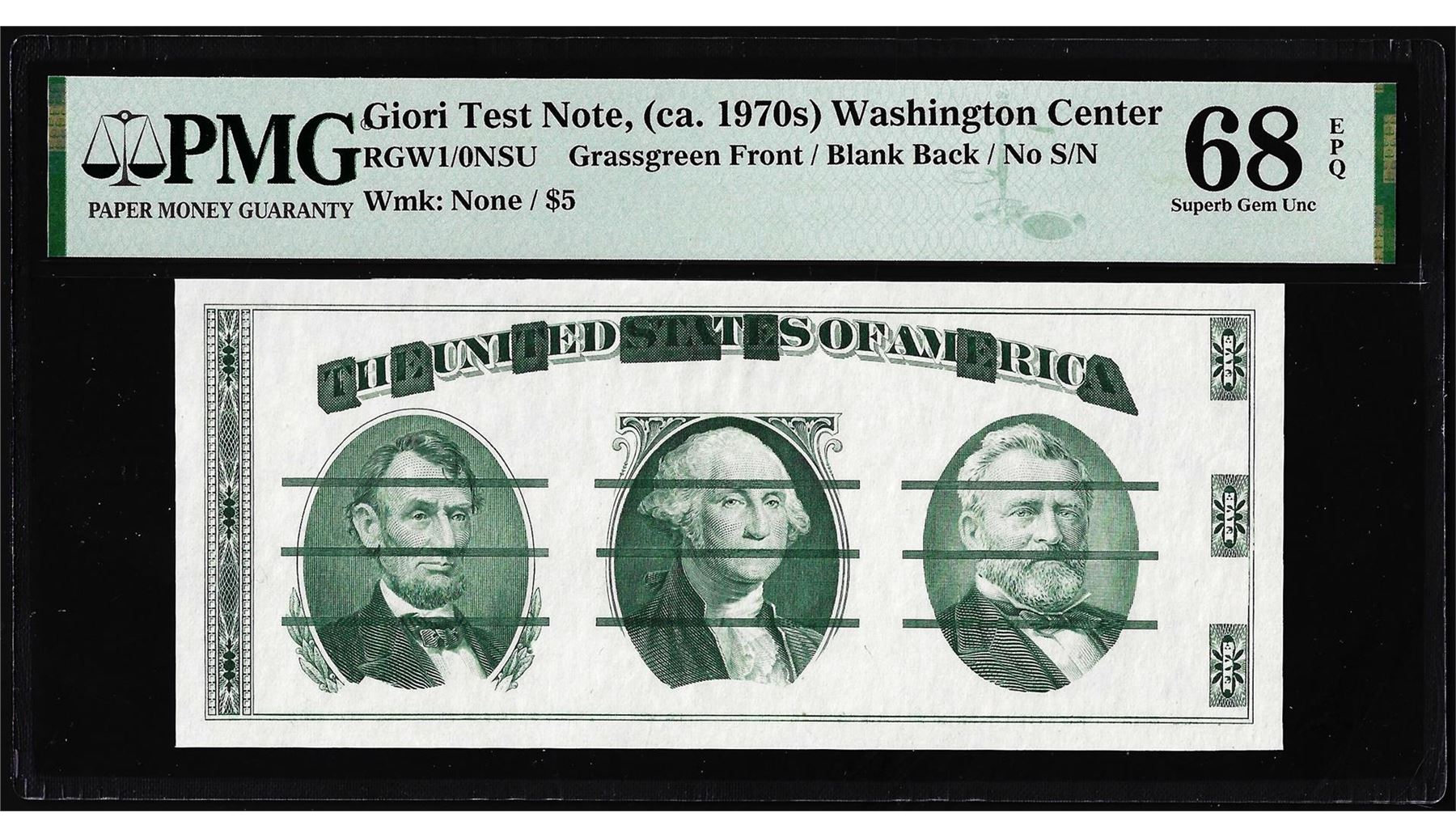One Circa 1970's Washington Center Giori Test Note PMG Superb Gem Uncirculated 68EPQ. PMG Certified.