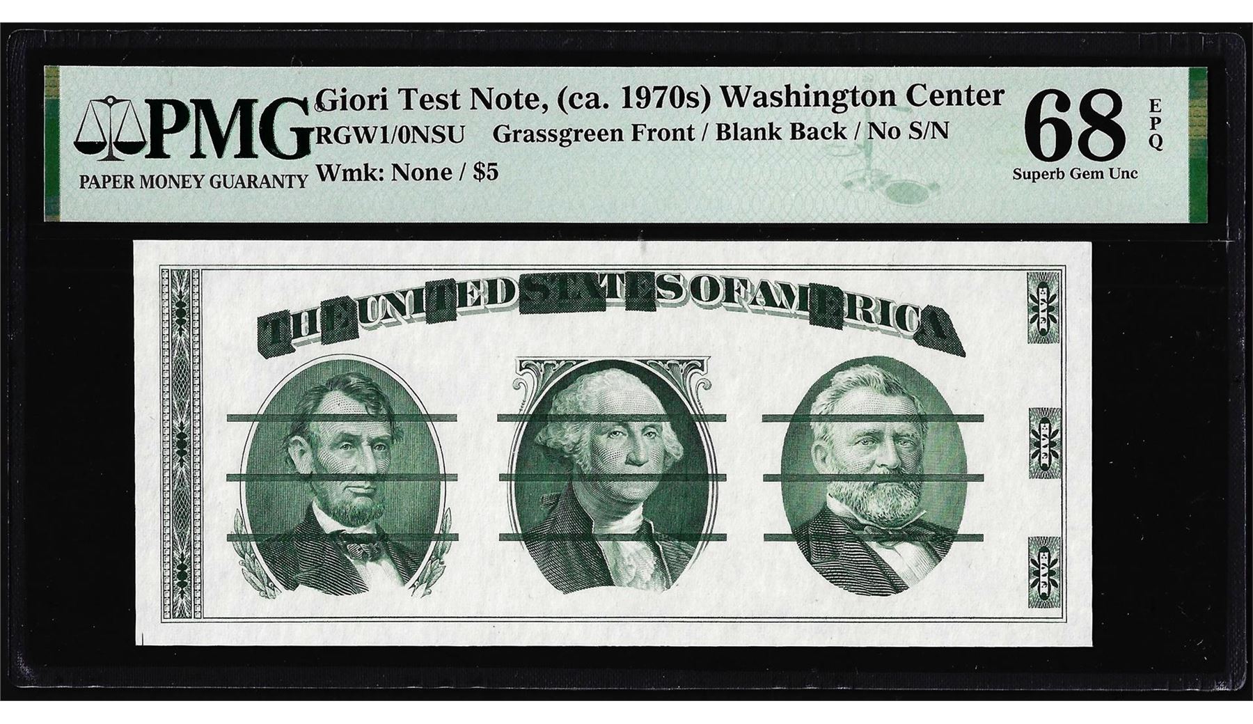 One Circa 1970's Washington Center Giori Test Note PMG Superb Gem Uncirculated 68EPQ. PMG Certified.