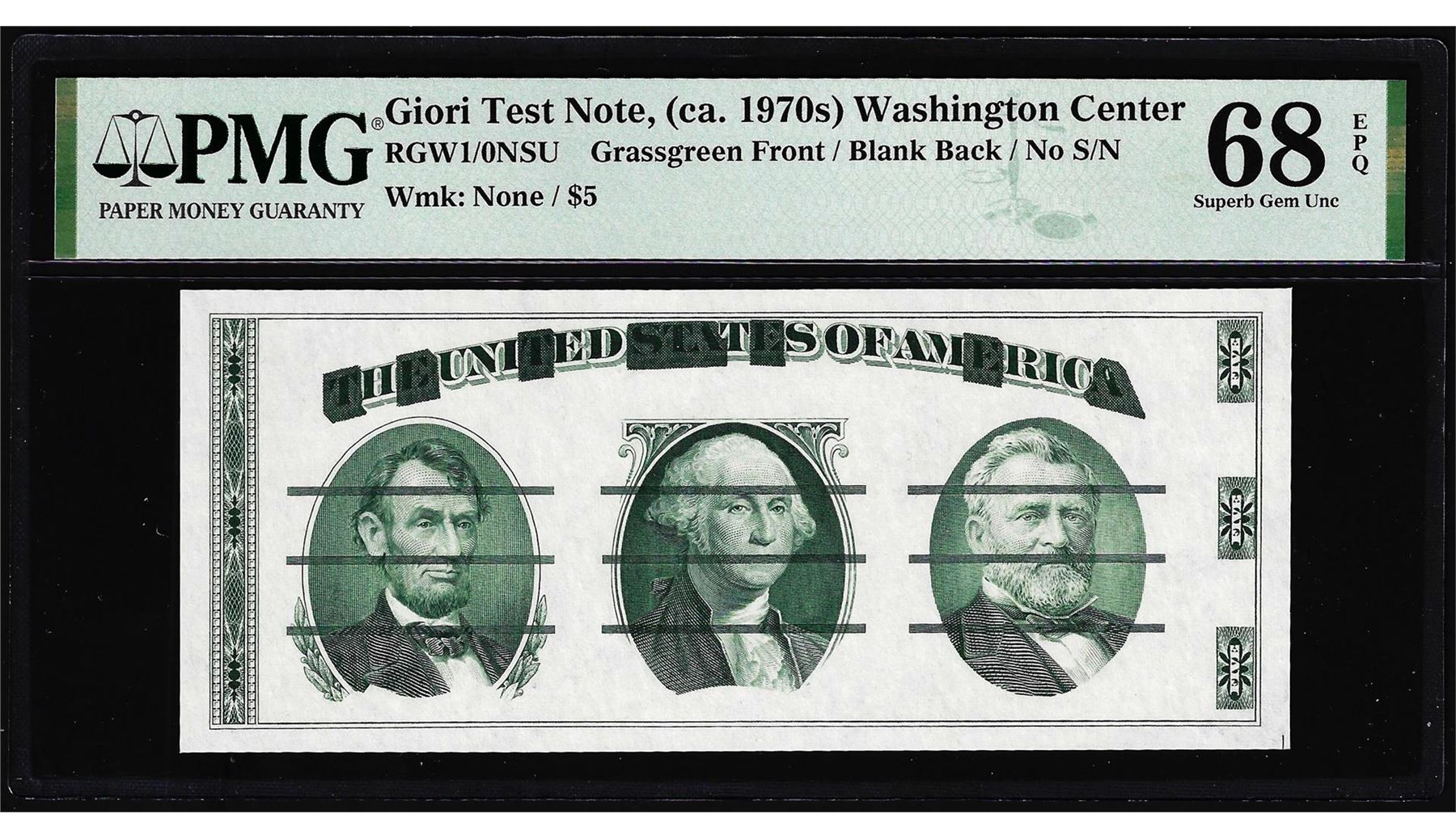 One Circa 1970's Washington Center Giori Test Note PMG Superb Gem Uncirculated 68EPQ. PMG Certified.