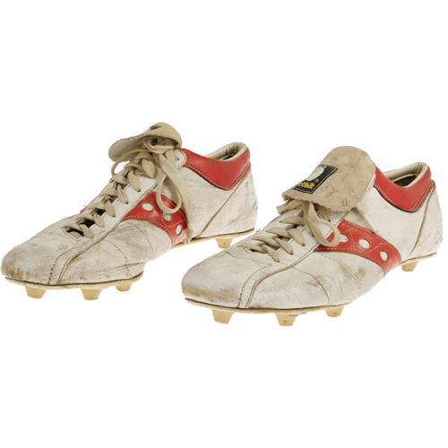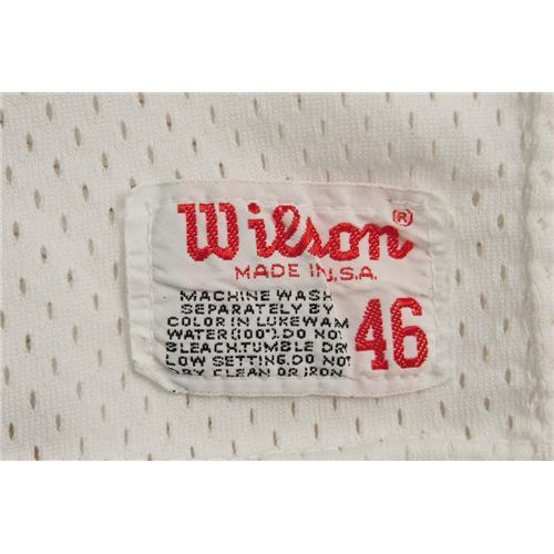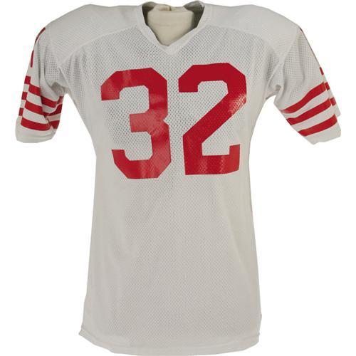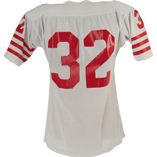 <B>Circa 1978 O.J. Simpson Game Worn Jersey & Cleats.</B></I> While the Hall of Fame running back is persona non grata throughout most of the sporting world following the horrific double-murder of his ex-wife and her friend, one can't help but assume that future generations will find Simpson to be one of the most fascinating 20th century sports figures, and will pay inordinate sums of money for artifacts such as these. So do your grandchildren a favor and bid on this jersey and cleats, worn by this slashing running back during his final years as a member of the San Francisco 49'ers. The white mesh jersey exhibits ample running back wear, with the shoulder area and "Wilson size 46" tail tag in particular exhibiting the results of tough, sweaty use. Simpson's preferred extra jersey length is evident here, and a nameplate removal suggests postseason practice use. The screened number "32" on chest, back and sleeves are, of course, present and accounted for however. The accompanying size eleven "Spot-Bilt" cleats, originally acquired from the same team source, show heavy wear and perfectly match photographs of Simpson from the era. The size (eleven) is also proper for the legendary rusher. Together this matched pair makes a terrific keepsake of one of the greatest, and certainly the most culturally significant, football players of all time. A letter from the consignor, a former assistant equipment manager for the 49'ers from 1977-1983, accompanies this lot. <I>LOA from Lou Lampson.</B></I><BR><BR><b>Shipping:</b> Clothing, Costumes & Jerseys (<a target="_blank" href="http://www.heritageauctions.com/common/shipping.php">view shipping information</a>)
