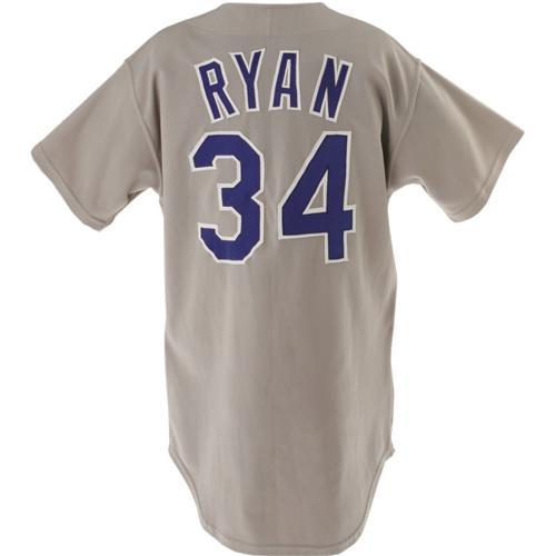 <B>Circa 1989 Nolan Ryan Game Worn Jersey.</B></I> Hall of Fame gamer from the undisputed Strike Out King derives from the personal collection of star reliever Duane Ward, who received the jersey directly from Ryan and attests to the fact in an included letter of provenance. The simple road grey style without sleeve patches allows us to pinpoint the jersey to the 1989-92 era, among the last of Ryan's storied career. "Texas" arches gently across the chest in blue and white tackle twill, with "Ryan 34" applied to verso. The proper "W.A. Goodman & Sons size 44" label inside the collar differentiates this jersey from the "Rawlings" contemporary jerseys that Ryan often signed and gave away but never wore. Wear is light, but appropriate for an aging superstar. With elite heritage and unbeatable provenance, this is a jersey collector's dream piece. <I>LOA from Lou Lampson.</B></I><BR><BR><b>Shipping:</b> Clothing, Costumes & Jerseys (<a target="_blank" href="http://www.heritageauctions.com/common/shipping.php">view shipping information</a>)