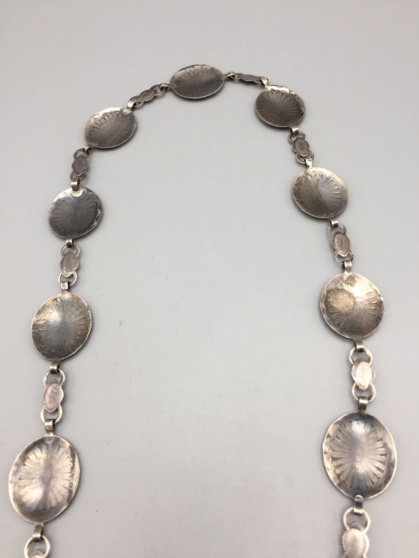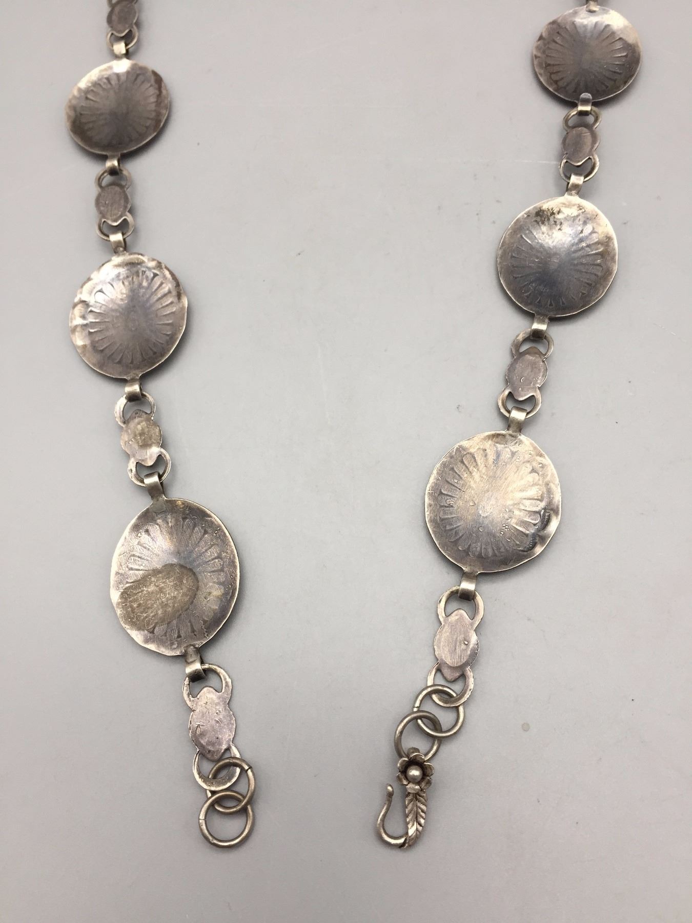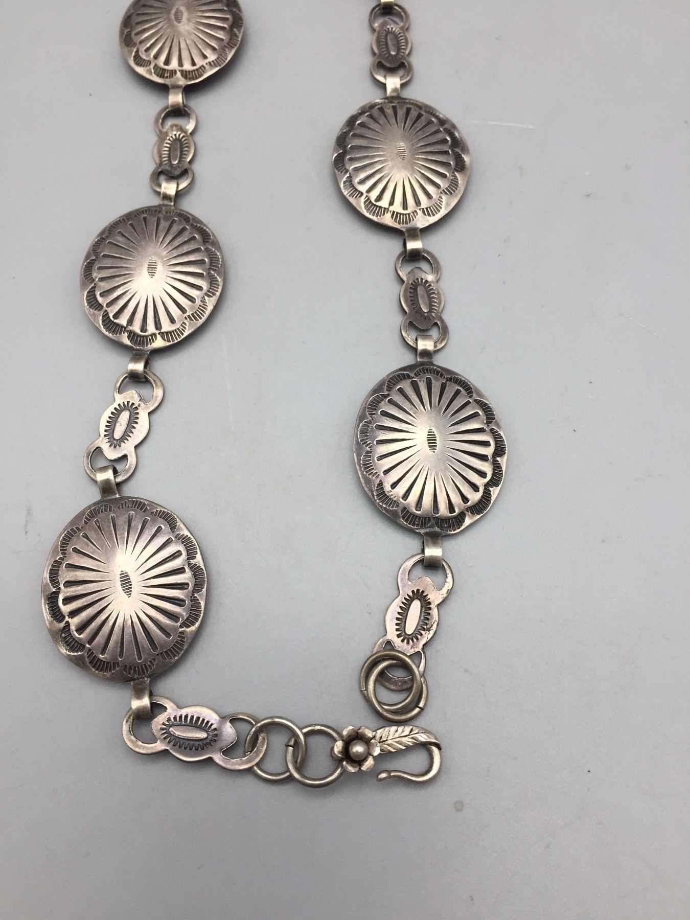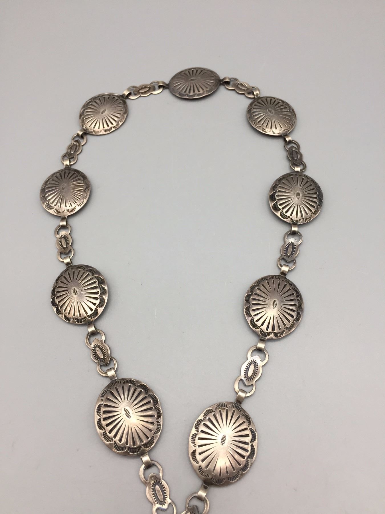 Description: Sterling silver, link style concho belt. Maker: Unknown. Approx. Age: Vintage, circa mid-century. Size: Belt measures approx. 30" long overall, each concho measures 1 1/2" x 1". Condition: Good for its age, normal wear expected. Please look closely at the pictures - they are an important part of our description. Shipping: There will be a $5 handling / packaging fee for shipping this lot. The actual cost of postage will be added on top of that.
