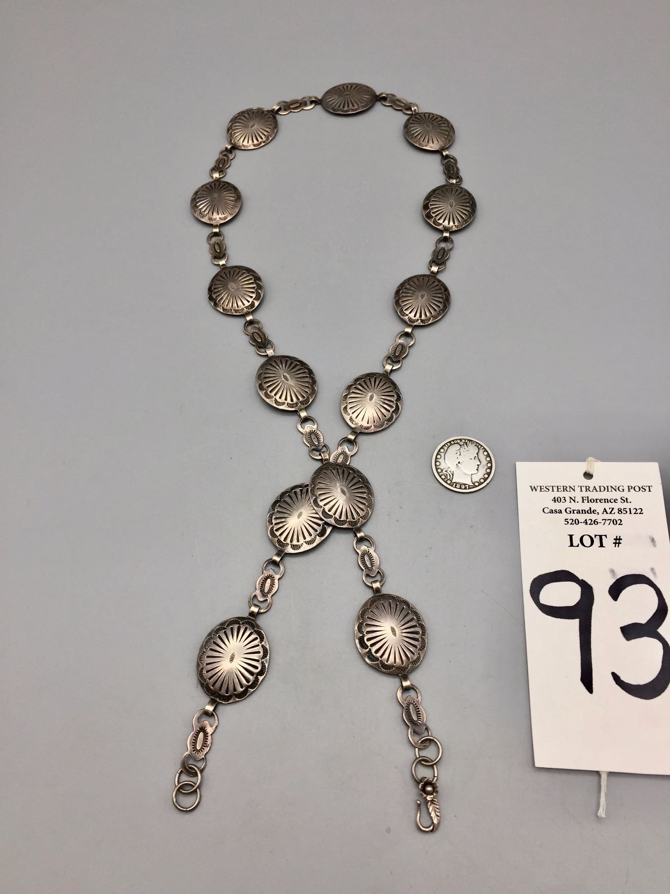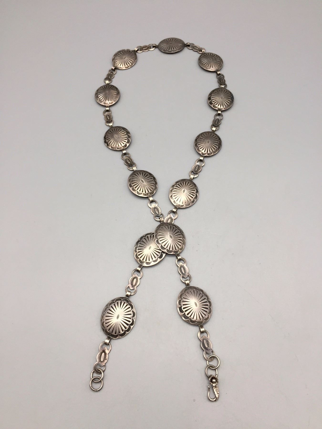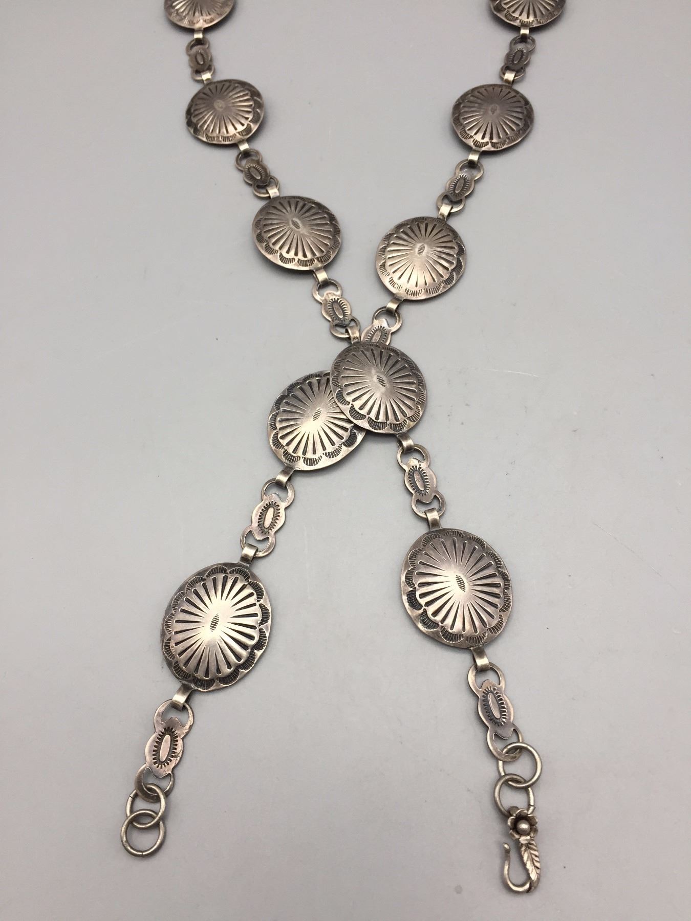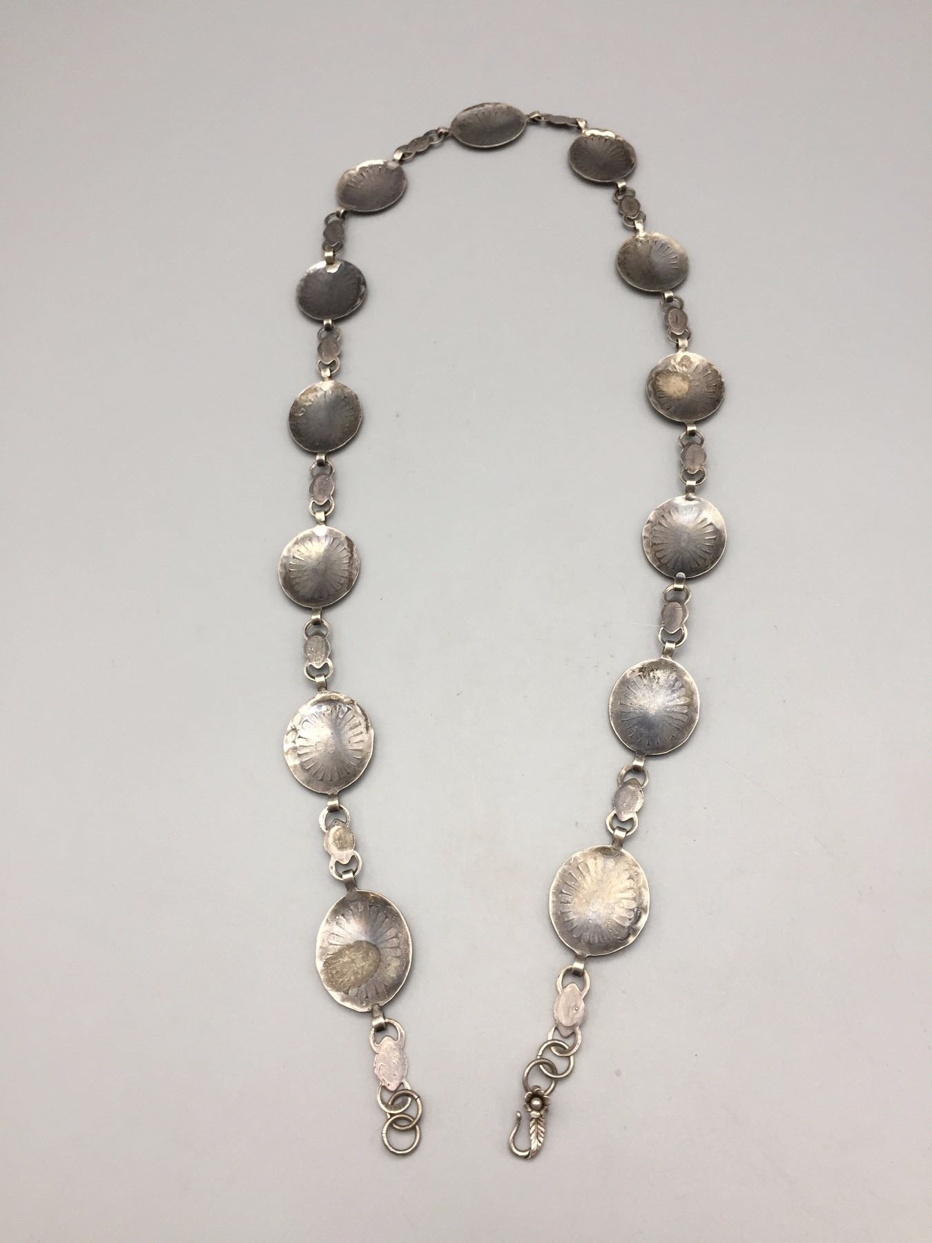 Description: Sterling silver, link style concho belt. Maker: Unknown. Approx. Age: Vintage, circa mid-century. Size: Belt measures approx. 30" long overall, each concho measures 1 1/2" x 1". Condition: Good for its age, normal wear expected. Please look closely at the pictures - they are an important part of our description. Shipping: There will be a $5 handling / packaging fee for shipping this lot. The actual cost of postage will be added on top of that.