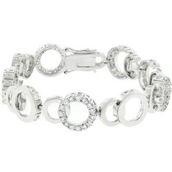 Shimmering circles perfect our Circle Bijoux bracelet. Adorned in simple shapes glistening cubic zirconia and silver toned hues this piece reinvents glamorous simplicity at the lock of its clasp. Our genuine rhodium finish is achieved using an electroplating process that coats the item with heavy layers of rhodium a close cousin to platinum which gives our jewelry a platinum luster.Base Metal: Lead Free Alloy (Brass)Style: , Setting Type: ProngsMaterials: , Stone Cut: RoundCarat Weight: 4.69 (ct)Color: , Plating Color: Silvertone FinishChain Clasp: 20.00Bracelet Size: 7 inchBracelet Clasp: LockStone Size: 1 (mm) x 1 (mm)Type: Link