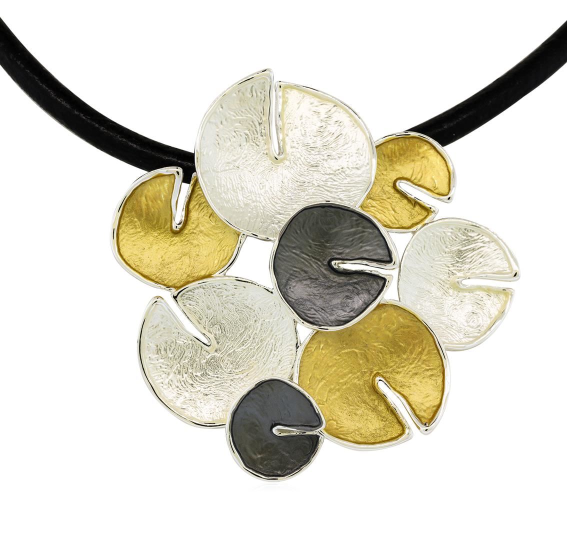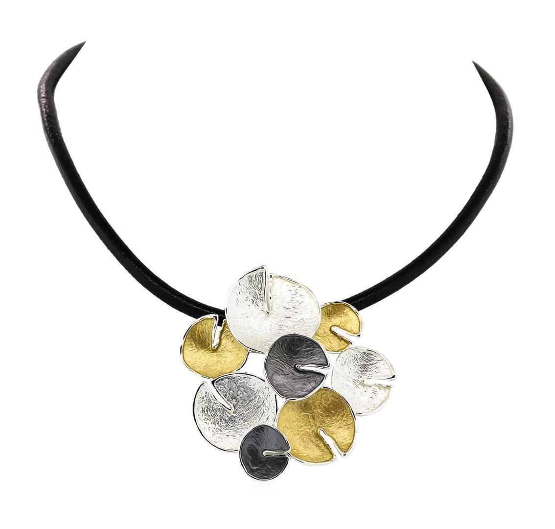 High end designer jewelry. Circle Cluster Pendant Necklace - Rhodium Plated. Rhodium Plated/3" Ext Clasp. Tricolor/ Blk. 16inches. Total Weight: 22.7 grams.