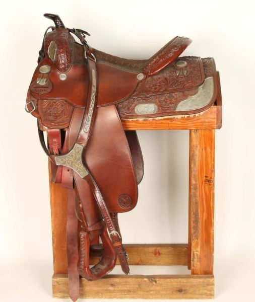 Smooth brown leather with a suede seat accented with oak leaf tooled pattern. Square skirt and engraved silver plated conchos." I.H.A.H.A. Champion West Snapple Bit Futuity, Arabian Horse Fair 1987". Includes breast collar and has a 15" seat.