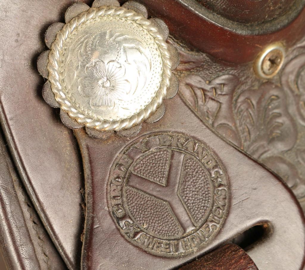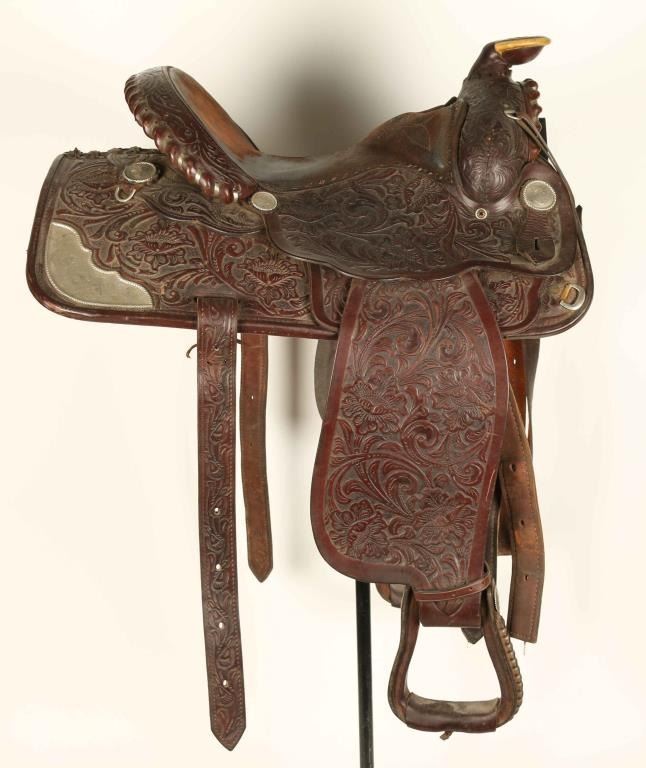 Brown floral tooled saddle maker marked accented with silver engraved overlaid conchos with a 16 1/2" seat. Good condition.