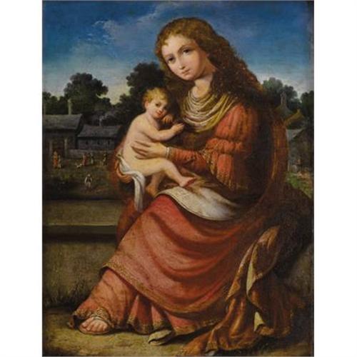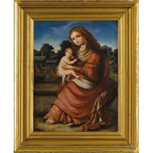 <B>Circle of DOMENICO ZAMPIERI (IL DOMENICHINO) </B></I>(Italian 1581-1641)<BR><I>Madonna and Child</B></I>, circa 1600-1610<BR>Oil on beveled mahogany panel<BR>15-3/8 x 11-3/4 inches (39.0 x 29.8 cm)<BR> <BR>Provenance:<BR>Mary Louise Fairchild MacMonnies Low;<BR>Thence by descent to the present owner<B>Condition Report:</B> Normal wear commensurate with age, surface dirt, minor craquelure, scattered strengthening and two diagonal fissures, revarnished<BR><BR><b>Shipping:</b> Requires 3rd Party Shipping (<a target="_blank" href="http://www.heritageauctions.com/common/shipping.php">view shipping information</a>)