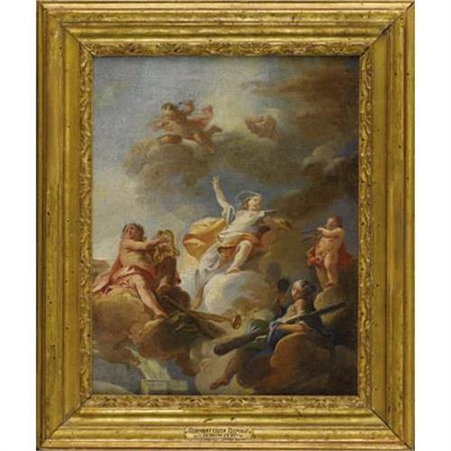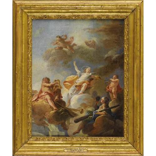 <B>Attributed to FRANZ ANTON MAULPERTSCH </B></I>(Austrian 1724-1796)<BR><I>Triumph of the Arts: Modello for a Ceiling Decoration</B></I><BR>Oil on canvas<BR>16 x 13 inches (40.6 x 33.0 cm)<BR>Unsigned<BR> <BR>Provenance:<BR>Deaccessioned from the California Palace of the Legion of Honor, The Fine Arts Museums of San Francisco, accession number 1930.12<BR><BR>Although this painting has traditionally been attributed Giovanni Battista Tiepolo (Italian 1692-1769), it is in fact closer in style to the work of the Austrian painter Franz Anton Maulpertsch (Maulbertsch). Its free, painterly manner strongly suggests it was a working sketch.<BR><BR>Franz Anton Maulpertsch was baptized at Langenargen on Lake Constance (Germany), June 7, 1724, and died in Vienna, August 8, 1796. He was the main representative of late Austrian baroque painting, son of the painter Anton Maulpertsch. He continued to develop and perfect the Austrian baroque tradition of P. Troger. From 1739 he was active in Vienna where he was a student of P. van Roys, later of van Schuppens. Maulpertsch worked in Vienna, Lower Austria, Hungary, Bohemia, Moravia, Dresden, and Innsbruck, creating ceiling paintings in palaces, churches, and monasteries. His style was profoundly influenced by the Italian painters G. B. Piazetta, G. B. Pittoni, and notably G. B. Tiepolo, as well as Bavarian and Austrian painters (J. E. Holzer, P. Troger) and Rembrandt, whose works he knew from copper engravings. Maulpertsch created dramatic, bold paintings in splendid colors, genre paintings, portraits, and graphic works. From the middle of the 1760s onwards, he tended towards greater clarity and order and finally adopted a more classical manner.<B>Condition Report:</B> Canvas is relined. Areas of discolored restoration in the clouds at upper right and lower left.<BR><BR><b>Shipping:</b> Requires 3rd Party Shipping (<a target="_blank" href="http://www.heritageauctions.com/common/shipping.php">view shipping information</a>)