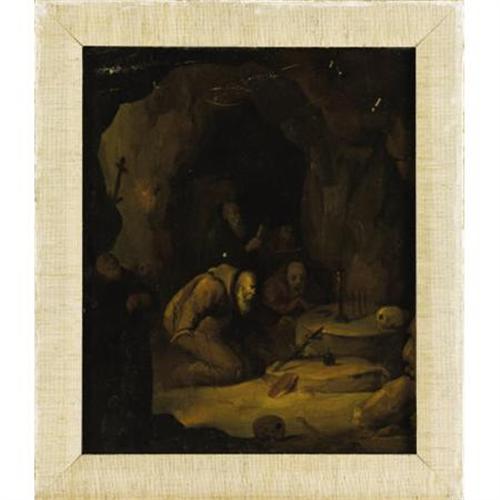<B>Circle of GERRIT DOU </B></I>(Dutch 1613-1675)<BR><I>St. Francis and Hermits in Prayer</B></I>, circa 1700<BR>Oil on beveled oak panel<BR>11-1/2 x 9-1/4 inches (29.2 x 23.5 cm)<BR> <B>Condition Report:</B> Scattered surface scratches along upper edge; one 1/4 in. scratch through to the ground in upper right.<BR><BR><b>Shipping:</b> Requires 3rd Party Shipping (<a target="_blank" href="http://www.heritageauctions.com/common/shipping.php">view shipping information</a>
