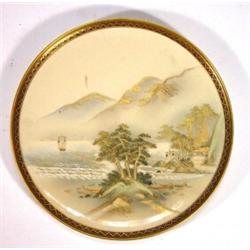 Circular Japanese Satsuma plate, hand painted and gilded with a coastline scene beneath mountains…