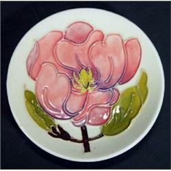 Circular Moorcroft dish, hand painted with ivory magnolia pattern, impressed marks to base, 12cm …