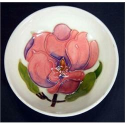 Circular Moorcroft shallow bowl, hand decorated with ivory magnolia pattern, impressed marks to base, 12cm diameter