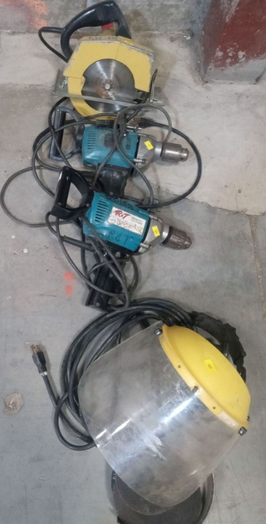 Circular Saw and 2 Makita Dills, Extension Cord, and Face Shield