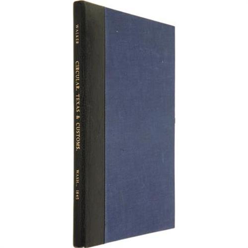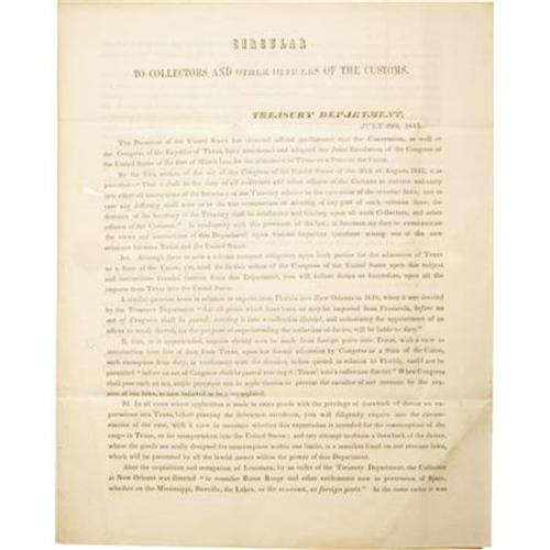 <B><I>Circular To Collectors And Other Officers Of The Customs</B></I></B></I><B>.</B></I> <B>[</B></I>Washington D.C.: United States Treasury Department] July 29, 1845. One folded folio page with integral blank serving as transmittal leaf. Signed in print by R.J. Walker, U.S. Secretary of the Treasury. Addressed to "<I>Collector of the Customs, Bath, Main</B></I> [sic]."<BR><BR>On February 28, 1845, the U.S. Congress passed a bill authorizing the annexation of the Republic of Texas. The date set for annexation was December 29 of the same year. This circular orders that duties on imports from Texas into the United States must continue being collected until such time as Congress establishes collection districts for the soon-to-be-annexed state. <BR><BR>The circular announces that "<I>although there is now a solemn compact obligatory upon both parties for the admission of Texas as a State of the Union</B></I>," duties on imports from Texas are to be collected as heretofore. This is said to be in accordance with the precedent established following the signing of the treaty with Spain in 1819, when exports from Florida to New Orleans were subject to duties. A precedent of similar action after the Louisiana Purchase, when Baton Rouge and "other settlements now in possession of Spain" were treated as foreign ports, is also cited. Protected in a dark blue half-calf case with blue cloth boards and gilt lettering along the spine. Minor paper loss on the integral blank where the seal was affixed, with red postal mark from "<I>Washington City Aug 3</B></I>." Document is pristine, with sharp edges and corners. Extremely rare. <I>From the collection of Darrel Brown.</B></I><BR><BR><B>Reference:</B></I> Streeter <I>Texas</B></I> 1624, locating only his copy now at Yale University.<BR><BR><b>Shipping:</b> Books & Catalogs (<a target="_blank" href="http://www.heritageauctions.com/common/shipping.php">view shipping information</a>)