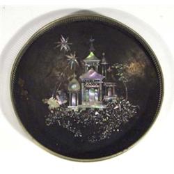 Circular ebonised gallery tray inlaid with mother of pearl Turkish style buildings, 21cm diameter