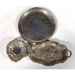 Circular silver dish, twin handled silver dish embossed with figures and a pierced bonbon dish, largest 16cm diameter