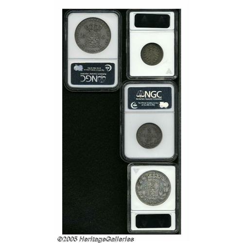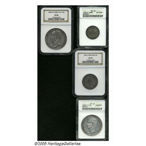 <B>Circulated European Silver in Slabs, </B></I>Finland 2 Markkaa 1865 XF45 NGC, France 5 Francs 1828A XF40 ANACS, Germany Mark 1874E AU58 ANACS, deeply toned, and Netherlands 2 1/2 Gulden 1848 XF40 NGC. <B>Sold as is, no return lot.</B></I>