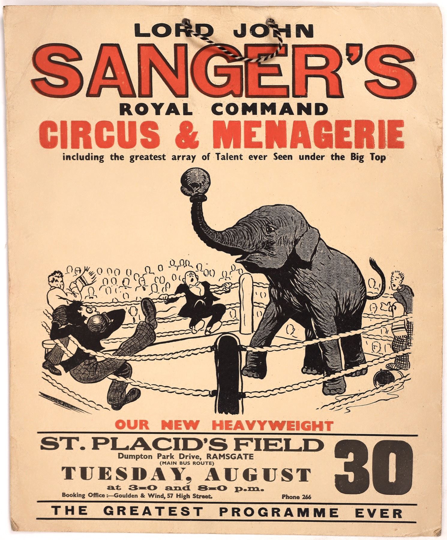 Broadside for Lord John Sanger's Royal Command Circus and Menagerie at St. Placid's Field. John Sanger was a circus owner from England who died in 1889. This broadside has a nice cartoon of an elephant fighting several men in a boxing ring. The broadside offers information about the date, time, and location of the circus and the location and phone number of the booking office. Broadside is 9.5 x 12.25, good condition. There is a string attached to the top that can be used to hang this broadside on a wall. City: State: Date: