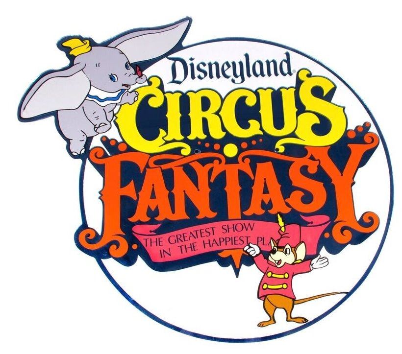 (Disneyland, c.1987) A beautiful display sign promoting Disneyland's "Circus Fantasy" spectacular. This special event only occurred in the Spring of 1986-89, making items from the events very rare. This mirrored sign features Dumbo imagery on the front and reads "The Greatest Show in the Happiest Place" below the logo for the event. This item measures approximately 20" in diameter and is in very good condition with little wear from use and a Disney copyright stamp on the back side.