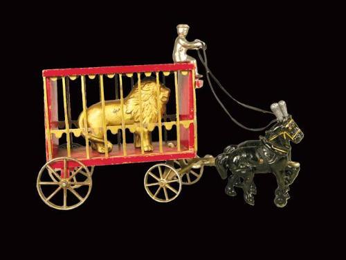 Circus Wagon Toy by Arcade. Wood Wagon with Cast Iron Lion and Cast Iron Horses. Approx. 20 inches long.