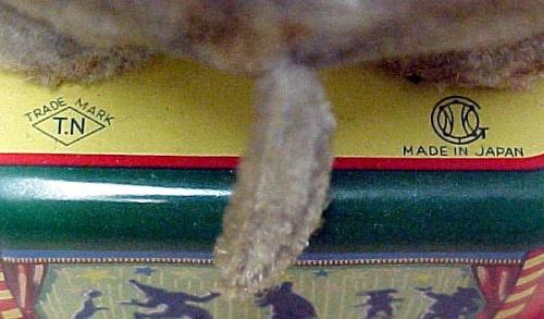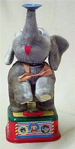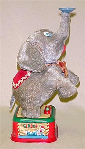 Circus elephant; metal and plush battery operated; 10" high; some wearing on plush.