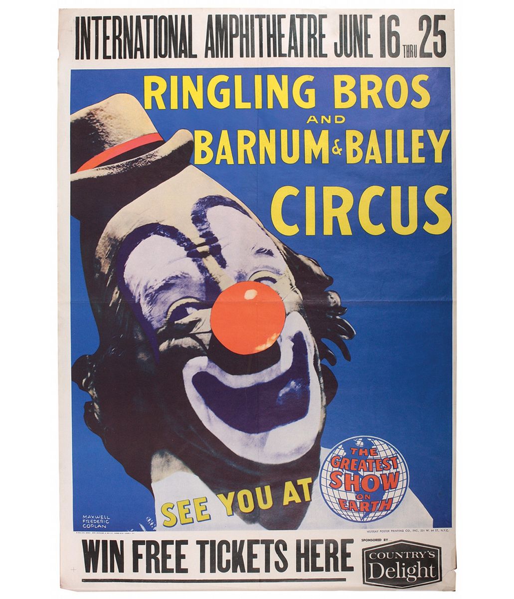 Circus poster, Ringling Bros. Barnum & Bailey "Greatest Show On Earth", large colorful poster w/smiling clown, c.1970's, VG cond w/some wear, 44"H x 30"W.