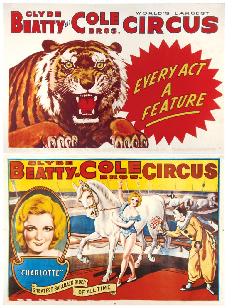 Circus posters (2), both Clyde Beatty & Cole Bros., one w/great tiger graphics, other w/"Charlotte", the greatest bareback rider of all time, both in Exc cond, 28"H x 42"W.