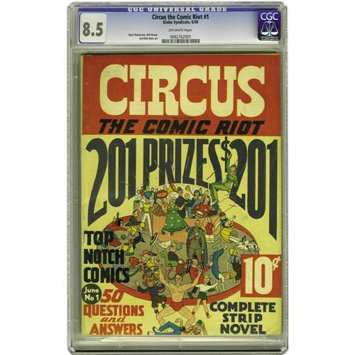 <B>Circus the Comic Riot #1 (Globe Syndicate, 1938) CGC VF+ 8.5 Off-white pages.</B></I> This comic from the dawn of the Golden Age features very early work of all-time greats Basil Wolverton, Will Eisner, and Bob Kane, and is also notable for being Jack Cole's second published comic book story. Gerber and Overstreet both consider this comic "scarce," and only one copy of this issue has been graded higher by CGC to date. Overstreet 2006 VF 8.0 value = $4,800; VF/NM 9.0 value = $7,000. CGC census 3/06: 2 in 8.5, 1 higher.