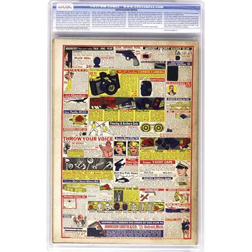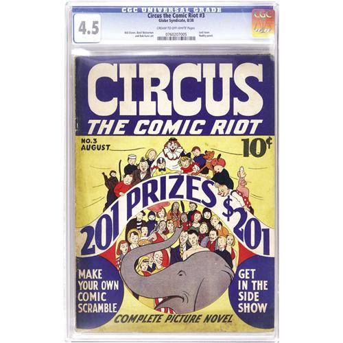 <B>Circus the Comic Riot #3 (Globe Syndicate, 1938) CGC VG+ 4.5 Cream to off-white pages.</B></I> A rare book that one doesn't see very often. How rare? Consider: 1) This is the first copy we've ever had the chance to offer; 2) It's one of only two that have been graded by CGC to date (the other is a 6.5); and 3) Overstreet calls it "scarce" and Gerber rates it "rare". Overstreet 2006 VG 4.0 value = $800. CGC census 7/06: 1 in 4.5, 1 higher. <BR><BR><B>Important notice:</B> Heritage usually auctions material at the rate of 200-250 lots per hour. On some occasions eBay Live bid software or the Internet may not be able to keep up with the pace of the auction. We recommend placing a realistic absentee bid now as insurance to avoid disappointment. Occasionally the auctioneer may eliminate or reject an eBay Live bid, and the auctioneer may also reopen a lot after the close of the eBay live bidding (usually because we missed an audience bid), and may reject your bid even if it shows you as the winning bidder. By bidding via eBay Live, you agree that Heritage may award the lot to another bidder at its sole discretion under the circumstances described above or any other reasonable circumstances. Since eBay bids are not shown to us until we open the lot on the floor, we treat those bids just like floor bids. In most cases the floor responds before the eBay bid is presented to us, due to Internet lag time, so for consistency we have made it a policy that floor bids are always considered first over tie eBay live bids. Also please note that all Heritage lots purchased through eBay Live carry a 22.5% Buyer's Premium. Please make sure you read the Terms and Conditions before you bid. This lot is being auctioned in conjunction with a live floor auction by Heritage Auction Galleries. All final auction and invoice information will be supplied by Heritage Auction Galleries, and all other information should be considered preliminary. Lot:41001 <BR><BR><B>Winning Notification and Billing:</B> After the FINAL session in this auction is complete, Heritage will send e-mail and snail mail invoices. This process normally takes several days. All final auction and invoice information will be supplied by Heritage Auction Galleries, and all other information should be considered preliminary. <BR><BR>This auction will be conducted on a live auction floor and over the Internet through eBay Live. If you choose to place an absentee bid, please take a moment to <font color='#0000ff'><u><a href='http://pages.ebay.com/liveauctions/help/before/laabsentee.html'>learn how eBay Live absentee bidding works</a></u></font><font color='#000000'>