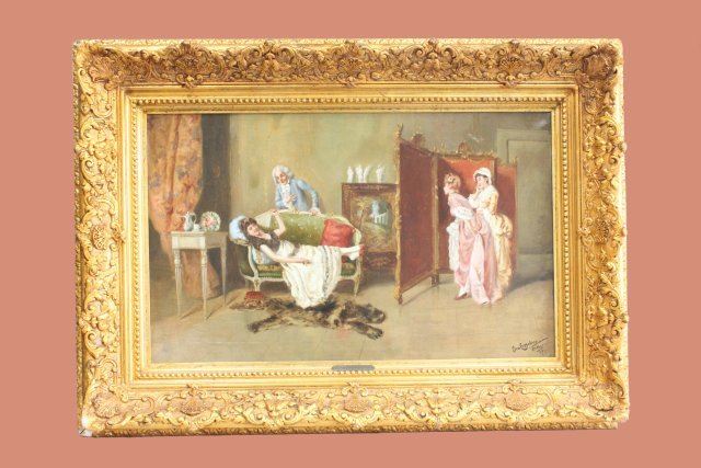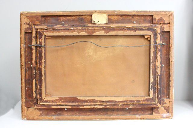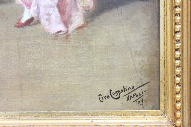 Oil on canvas. Dated 1904. Napoli. Approx. 28" W x 17" H unframed, 37" W x 27" H framed.