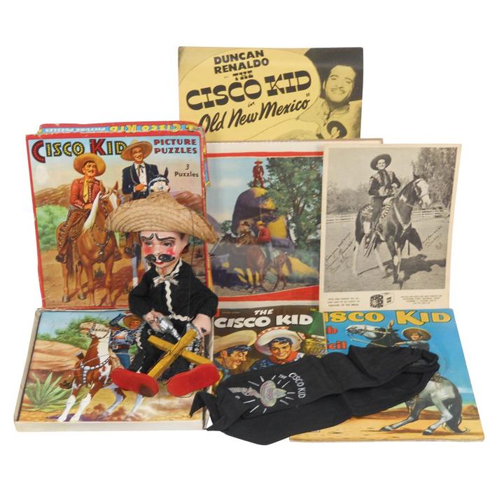 Cisco Kid items, includes string puppet, publicity program, lobby card, puzzle in box, comic, tie, bread picture & Rub-a-Pencil book, c.1940's-1950's era, all Good to Exc cond.
