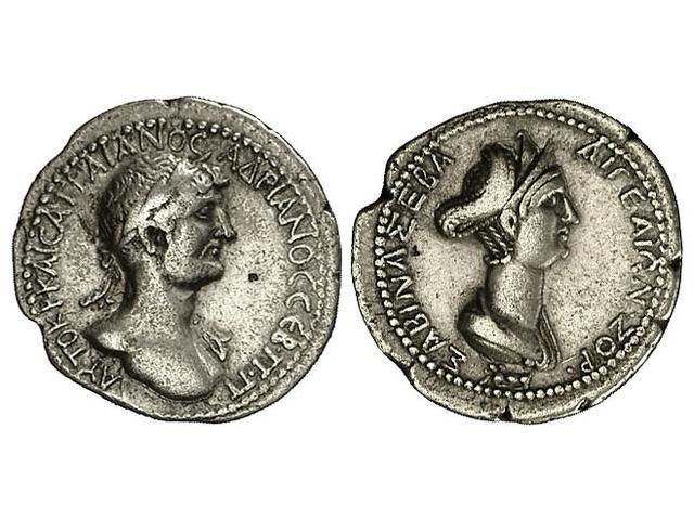 Cistóforo. 177 d.C. ADRIANO y SABINA. AIGEAI. Anv.: Busto laureado de Adriano a derecha. Rev.: Busto de Sabina a derecha. AR. MUY RARA. GIC-No cat. MBC+.