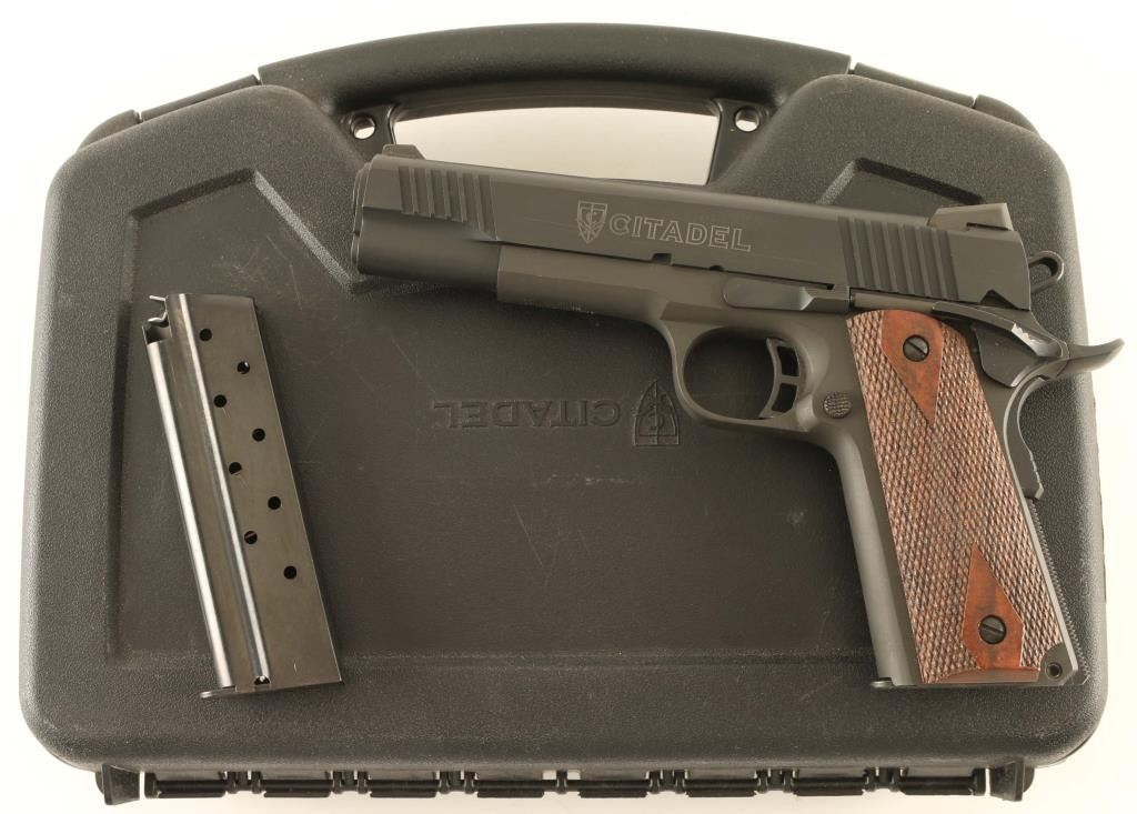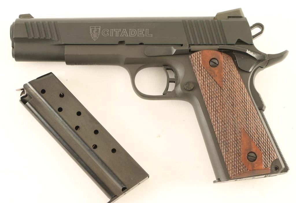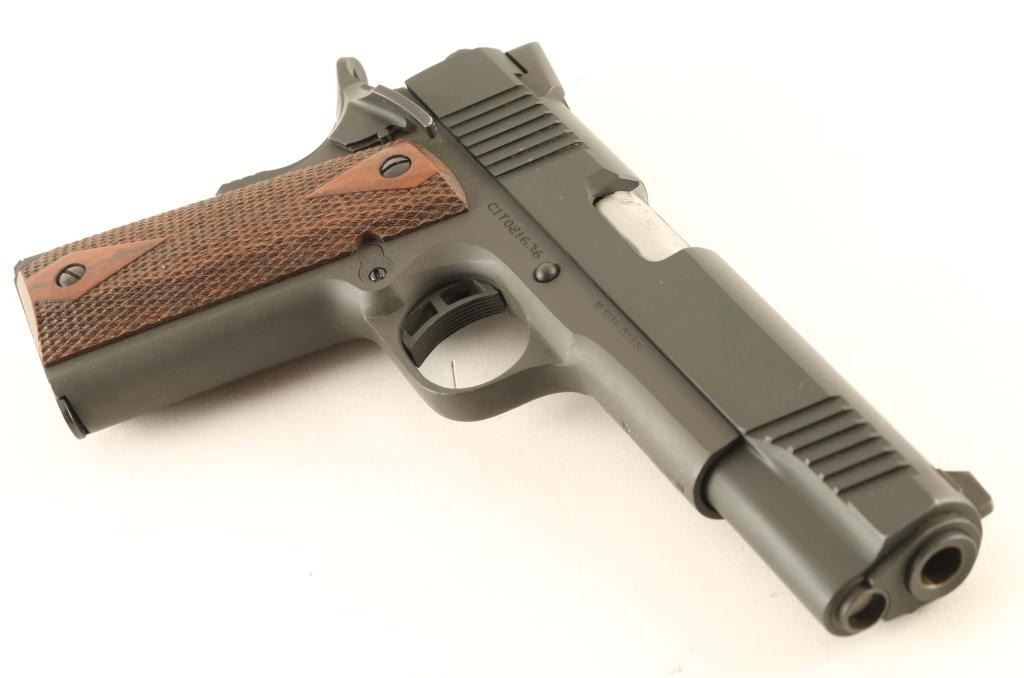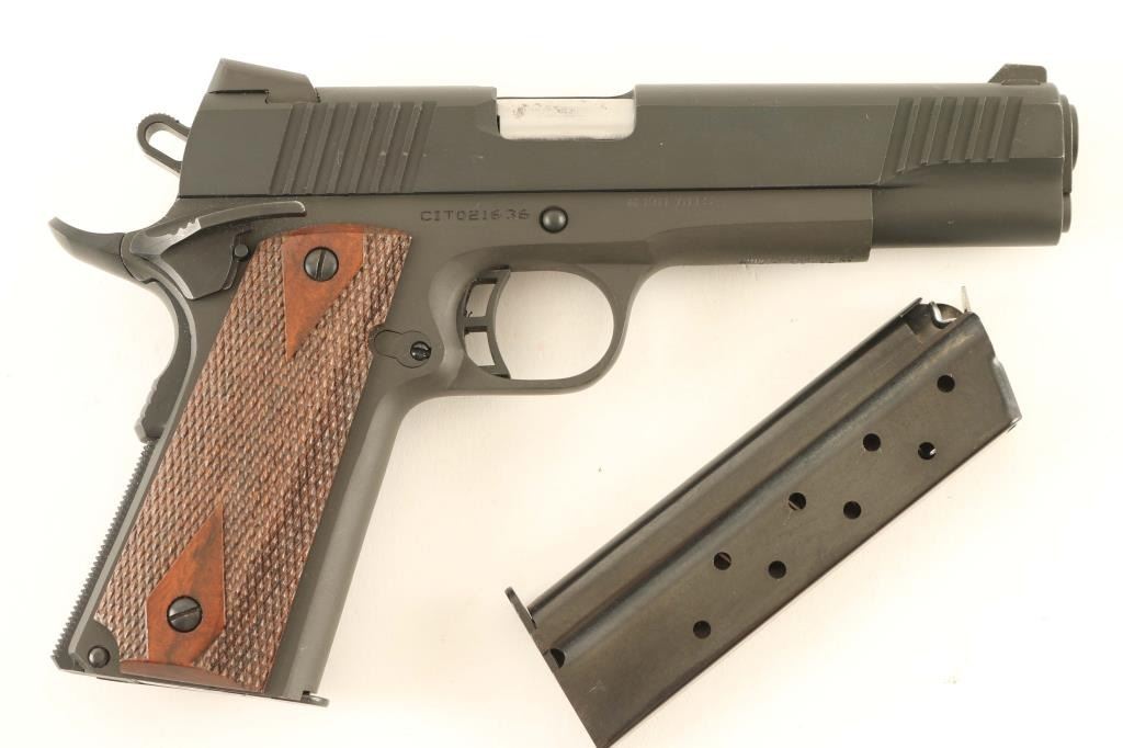 Phillipine Islands semiautomatic pistol, imported by AP INTL, Pahrump NV. Government sized 1911 style semiautomatic pistol features matte blued or parkerized finish, 5" barrel, fixed sights in dovetails, extended ambidextrous manual safety, beavertail style grip safety, full length recoil spring guide, double diamond checkered wood grips, slide serrations front & back. Bore is excellent condition. Overall external appearance is Excellent, like new, few signs of handling. Includes factory plastic case, manual, cable lock, two magazines. Condition is NRA Excellent - Like New *** Modern Firearm ***
