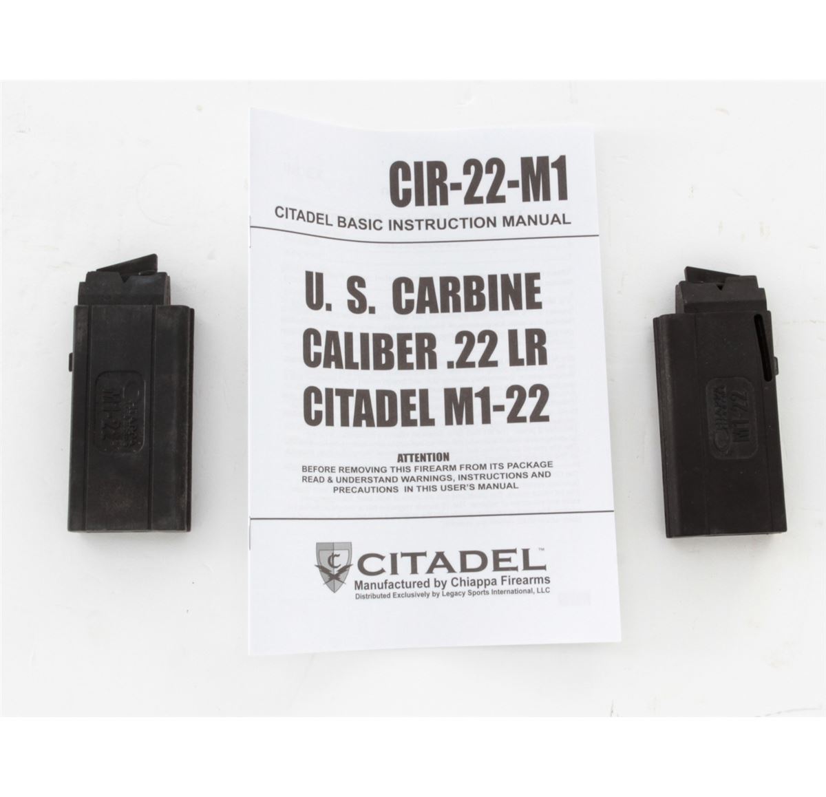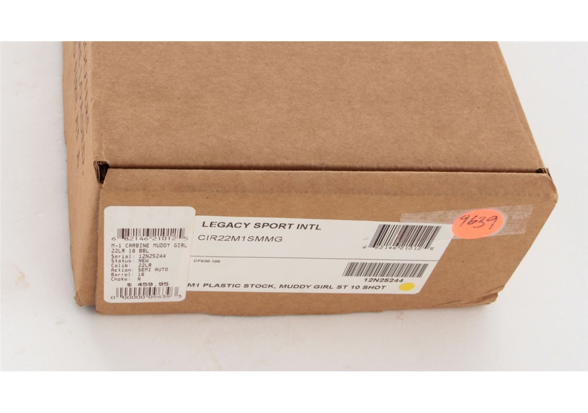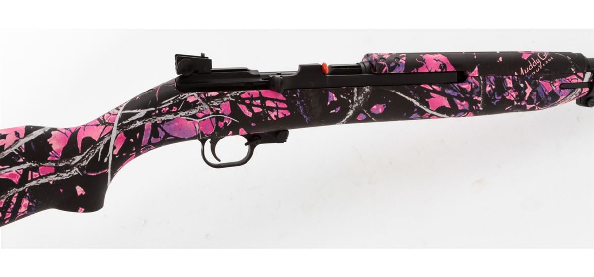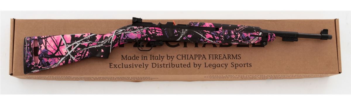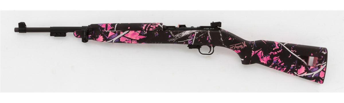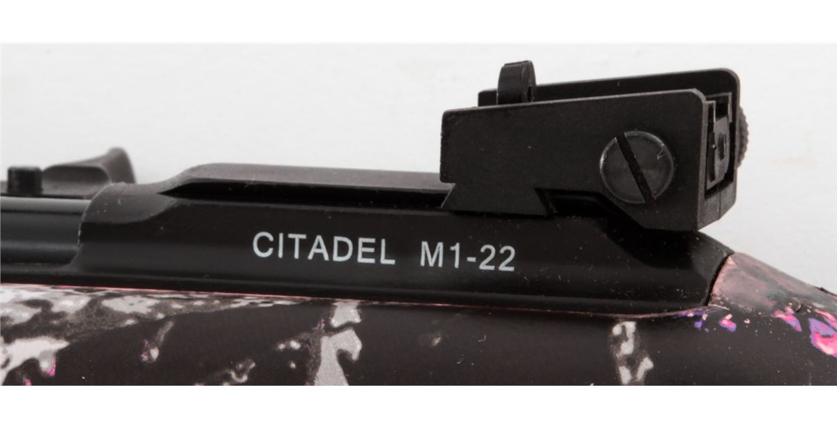 Citadel Model M1-22 Semi-Automatic Rifle, #12N25244, .22 LR cal., 18'' barrel, matte blue finish, synthetic pink Muddy Girl camouflage stock and handguard, adjustable rear sight, fixed front sight, synthetic bayonet lug, front sling swivel, with two (2) magazines, in box with matching end label and owner's manual. Mfg'd in Italy by Kimar. Condition is excellent, remaining new and unfired, with original hang tag still intact. Retails @ $459.95. Est.: $200-$400. (Modern) (Field Time)
