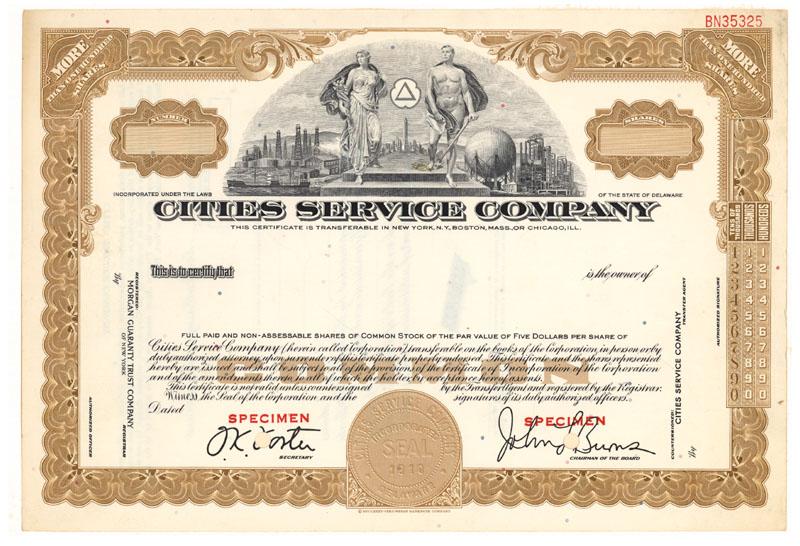 [SPECIMEN] ----, Delaware. Stock certificate specimen in Cities Service Company. Gold / Black. Vignette of an allegorical male and female with derricks and a refinery in background at top center. Stamp and punch cancelled.