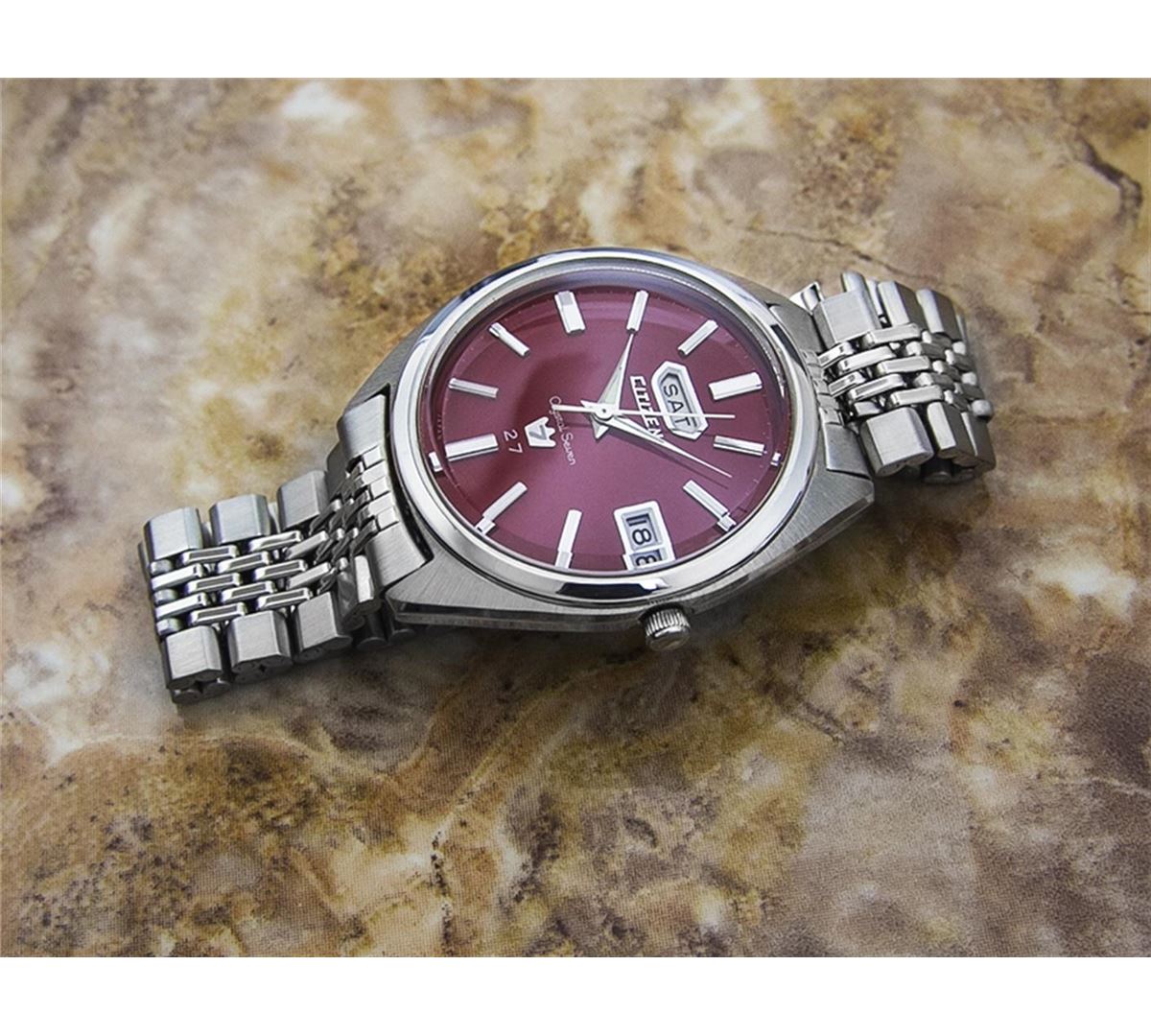 Citizen Crystal 7 Day Date Stainless Steel Automatic Watch. Brand: CITIZEN. Model: CRYSTAL 7. Movement: Automatic. Case Material: Stainless Steel. Crystal: MINERAL GLASS. Case Size: 43X38. Band: Stainless Steel BRACELET.