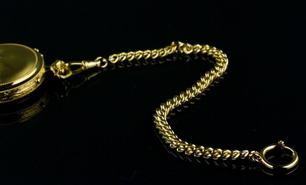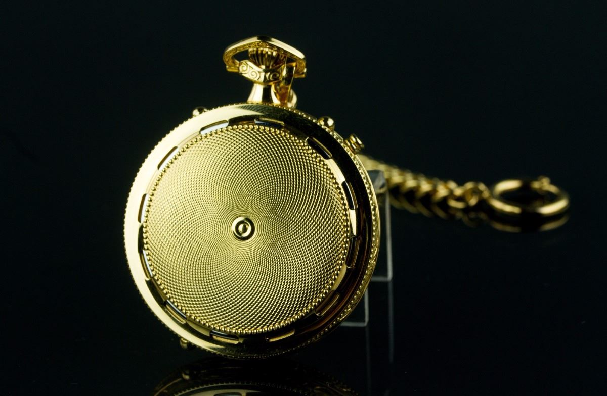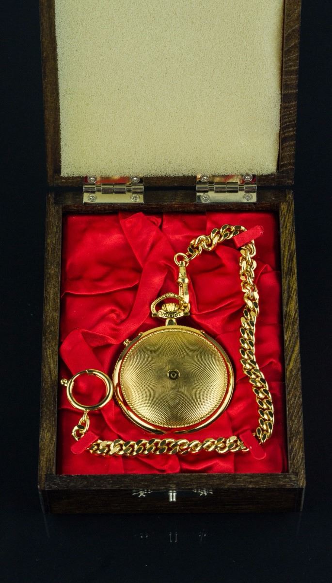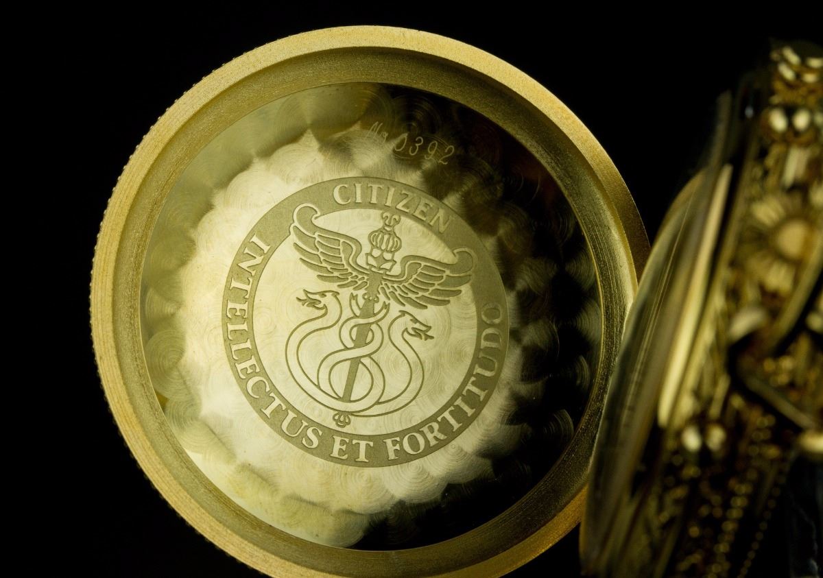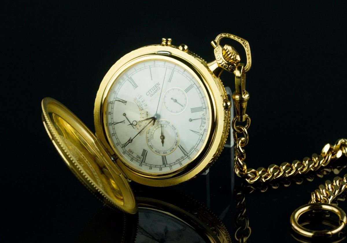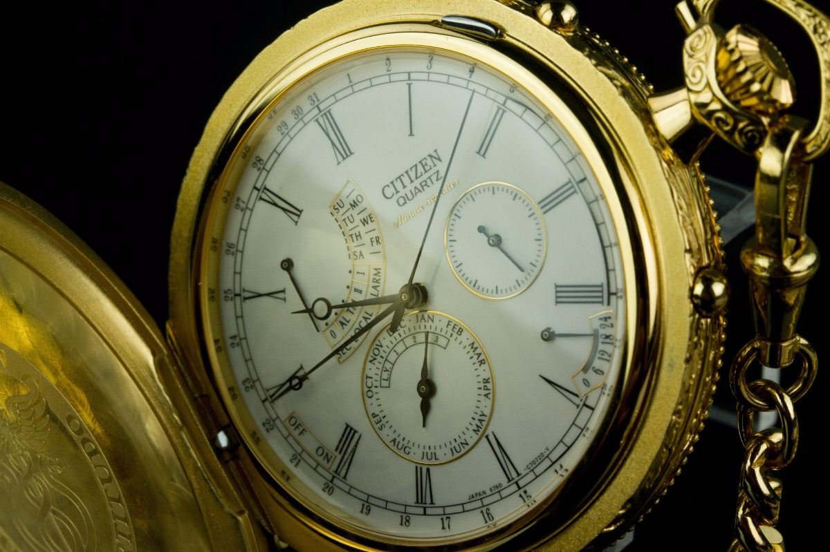 Citizen Quartz pocket watch with chains; centred with subsidiary dials for month, day and hours; engraved with "Citizen Intellectus Et Fortitudo" inside the front cover; accompanied with original tag and case; D: 4.5 cm, 111 grams