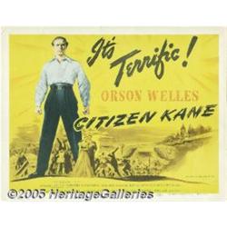 <B>Citizen Kane (RKO, 1941)</B></I> Title Lobby Card (11" X 14"). Charles Foster Kane, one of the richest men on earth, dies almost alone in the master bedroom of his huge estate, Xanadu. Before he dies, he breathes one last word, "Rosebud". But what does that mean? Newsreel reporter Jerry Thompson is assigned to find out. By interviewing the people most important to Kane, he finally finds the measure of what is ultimately a lonely and embittered man. Orson Welles, making his first film, ended up with what many people consider to be the best film ever made. This beautiful, bright title card has a couple of minor corner dings, minor edge tears, some tape on the back, and a paper clip stain at the top border. A very clean card with vivid colors. Very Fine+.