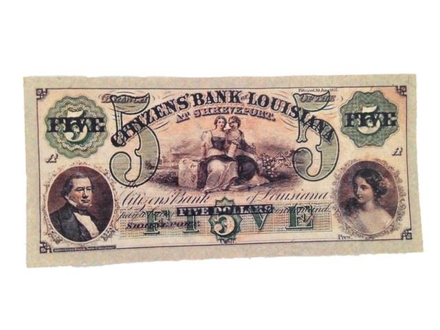 Screen used, "Citizen's Bank of Louisiana" Five dollar bank note. (approx. 7" x 3") Condition May Vary Slightly.