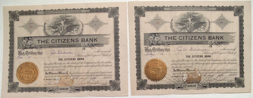 Lot of 2 stocks from the Citizens Bank. Incorporated under the laws of the state of South Dakota. Stock numbers 38 for 40 shares and 40 for 5 shares issued to J.W. Starbuck on June 14, 1913. Each stock measures 11” x 8.75” and show some minor wear including creases.