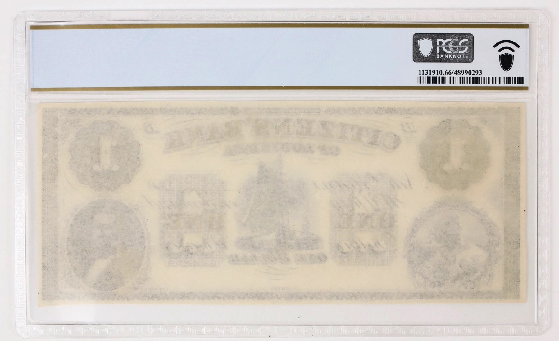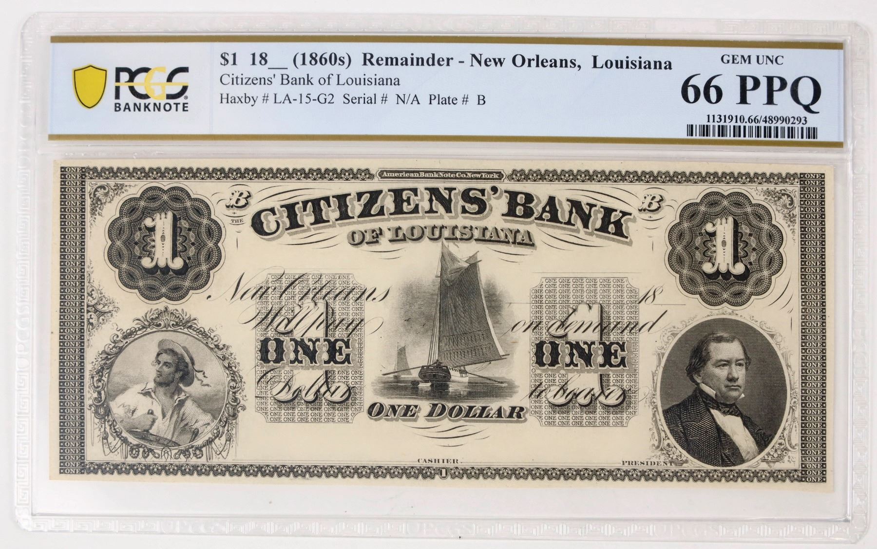 PCGS certified Gem Uncirculated 66 Premium Paper Quality! Citizens' Bank of Louisiana $1 18__ (1860s) Remainder note. Haxby # LA-15-G2. No serial number. Plate # B.