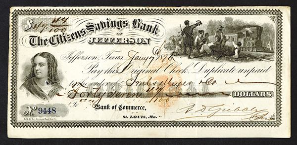 Jefferson, Texas. $47.47, I/U with spindle cancel, Black with RN H-3 Imprinted Revenue, Young girl on left, top right with men and women waving at train, corresponding bank in St. Louis, Missouri, VF condition. ABNC.