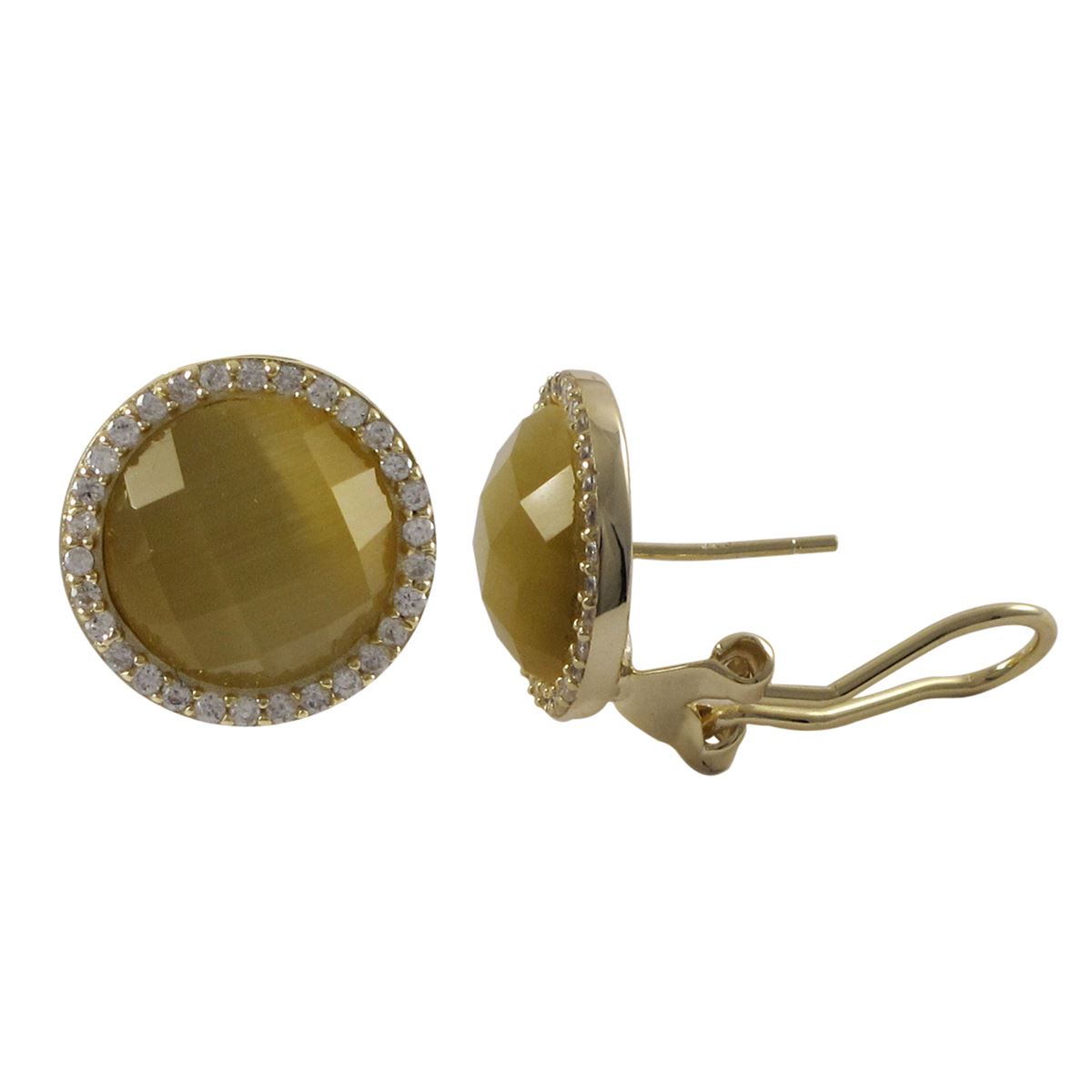 Citrine Cat's Eye Semi Precious Faceted Stone, Set In Gold Tone Sterling Silver With CZ Border, 15Mm Round Stud Post Clip Earrings