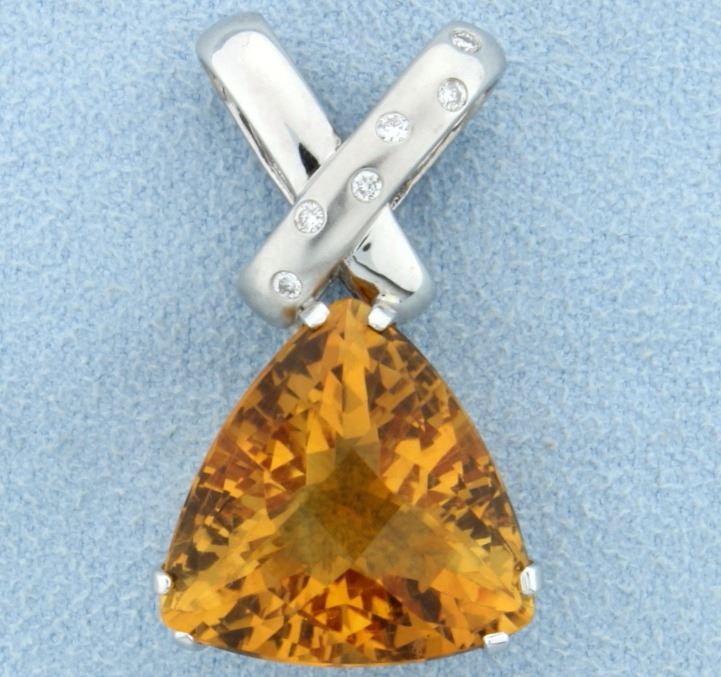 Pendant is in 18K white gold, the trillion cut citrine measures 18x18mm, "AAA" quality. There are .12 ct total weight of F color/VS clarity diamonds. Pendant is 1 1/4 inches long. 8.2g