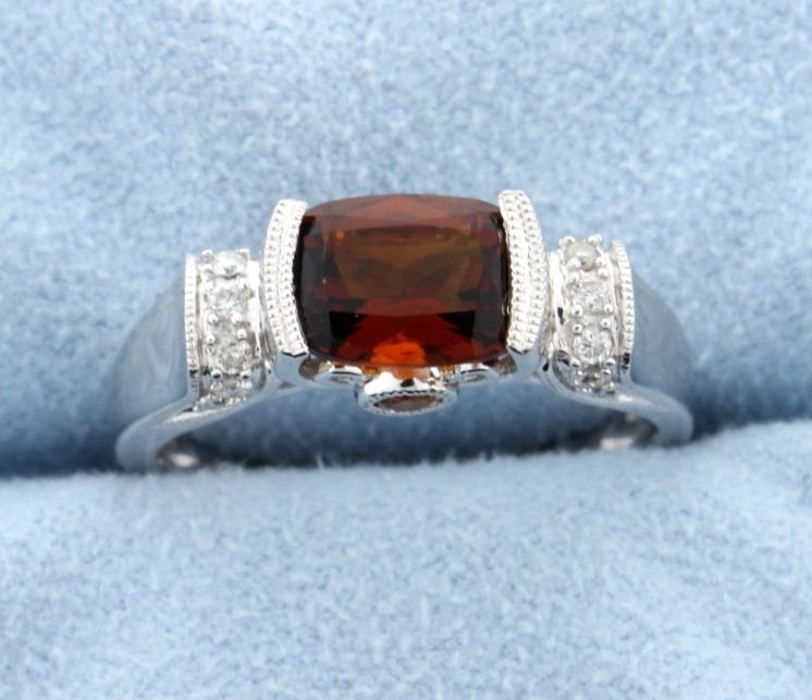 This fantastic style ring is set in 14k white gold. The center is a cushion shape, 8mm x 6mm, 1.50 carat deep orange Citrine gemstone. There are two bezel set round Citrine, lighter shade, gemstones set on either side of the mount. The 14 brilliant cut, SI clarity and H-I color, diamonds total 0.18 carats are sparkle bright! Size 6 1/2 - 7 4.0g