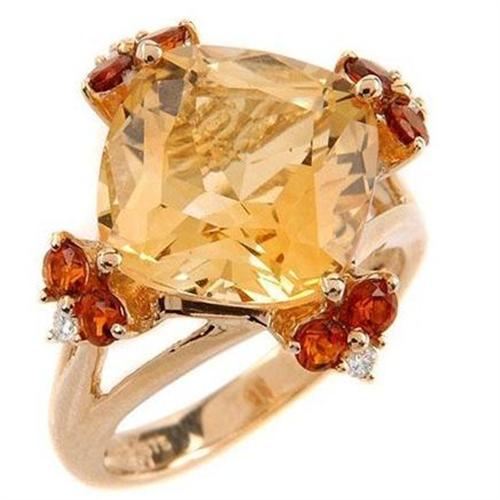 Size 10: One cushion cut, 6ct. golden honey citrine, eight round, .80ctw. garnets and and two round, .04ctw. diamonds are prong set in this durable 9kt. yellow gold ring. With these significant stones and striking color combination, this piece would be a great fashion accessory and a good size for, perhaps, and index finger.