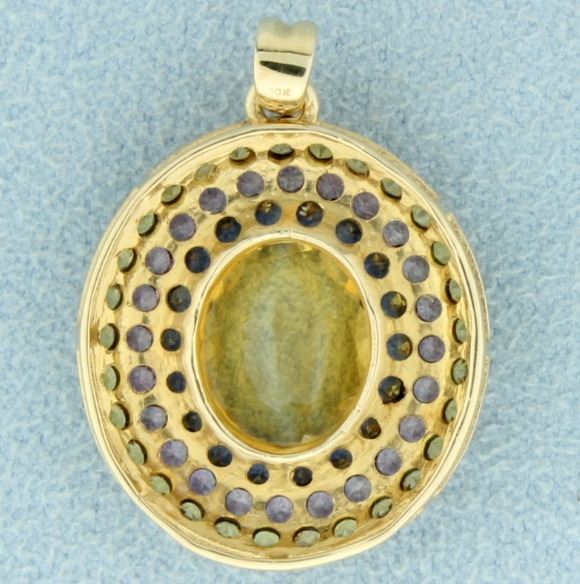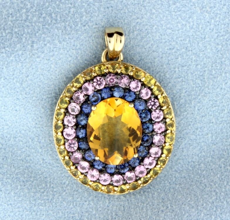 In 10K yellow gold, it is 1 inch long and the center is a 11x9mm oval citrine. Surrounded by 72-2mm round  blue spinel, pink topaz, and yellow citrine gemstones. All beautiful color and clarity.           3.7g