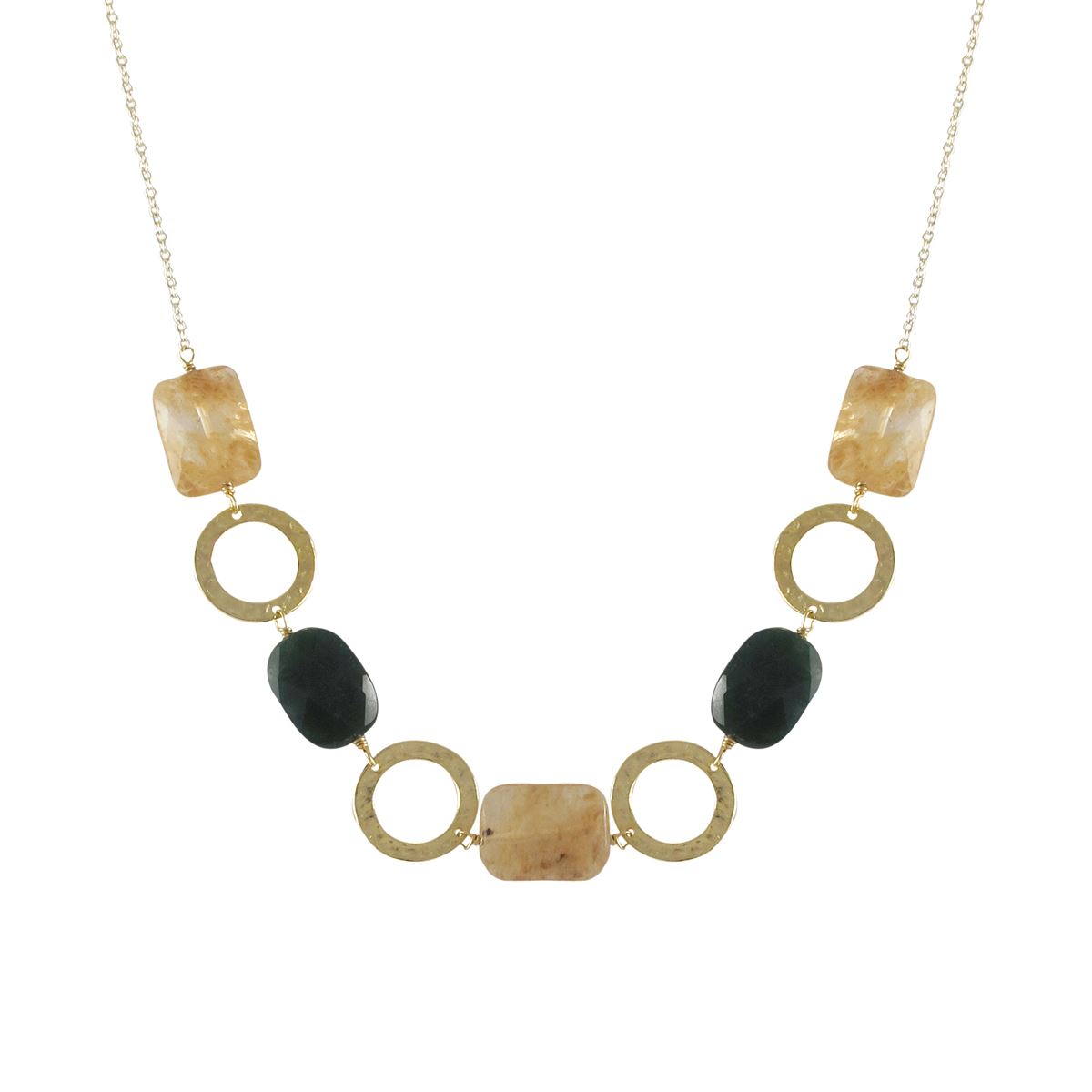 Citrine Rutilated And Fancy Jasper Combination Semi Precious Stones With Open Rings On Gold Plated Brass Chain Necklace, 18" 2"