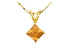 A square natural citrine is securely held in a luscious 14K yellow gold prong setting. This gemstone pendant has a total weight (TGW) of 1.00ct and comes with a standard 16 14K yellow gold chain.
